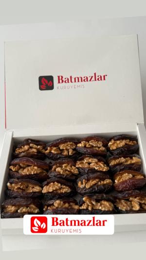 Batmazlar ürünü. Jumbo gerçek Kudüs hurması arasında yerli kelebek maraş cevizi ile premium bir lezzet! Doğal, katkısız. Tatlı krizlerinize sağlıklı bir çözüm.